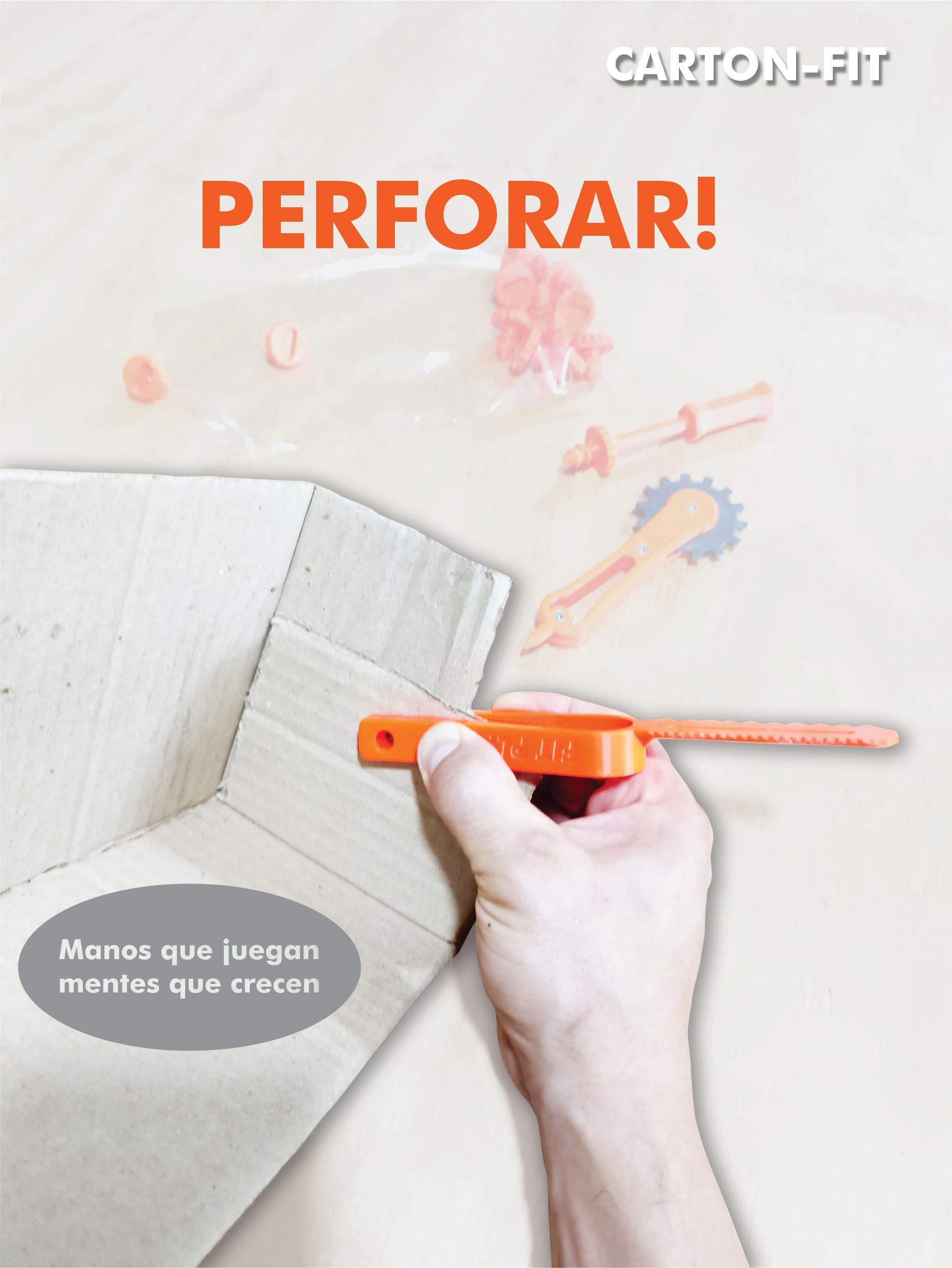 Carton-Fit es un kit de herramientas pensado para que niñas y niños (+5 años) puedan crear, cortar, plegar y construir sus propios juegos usando cartón.