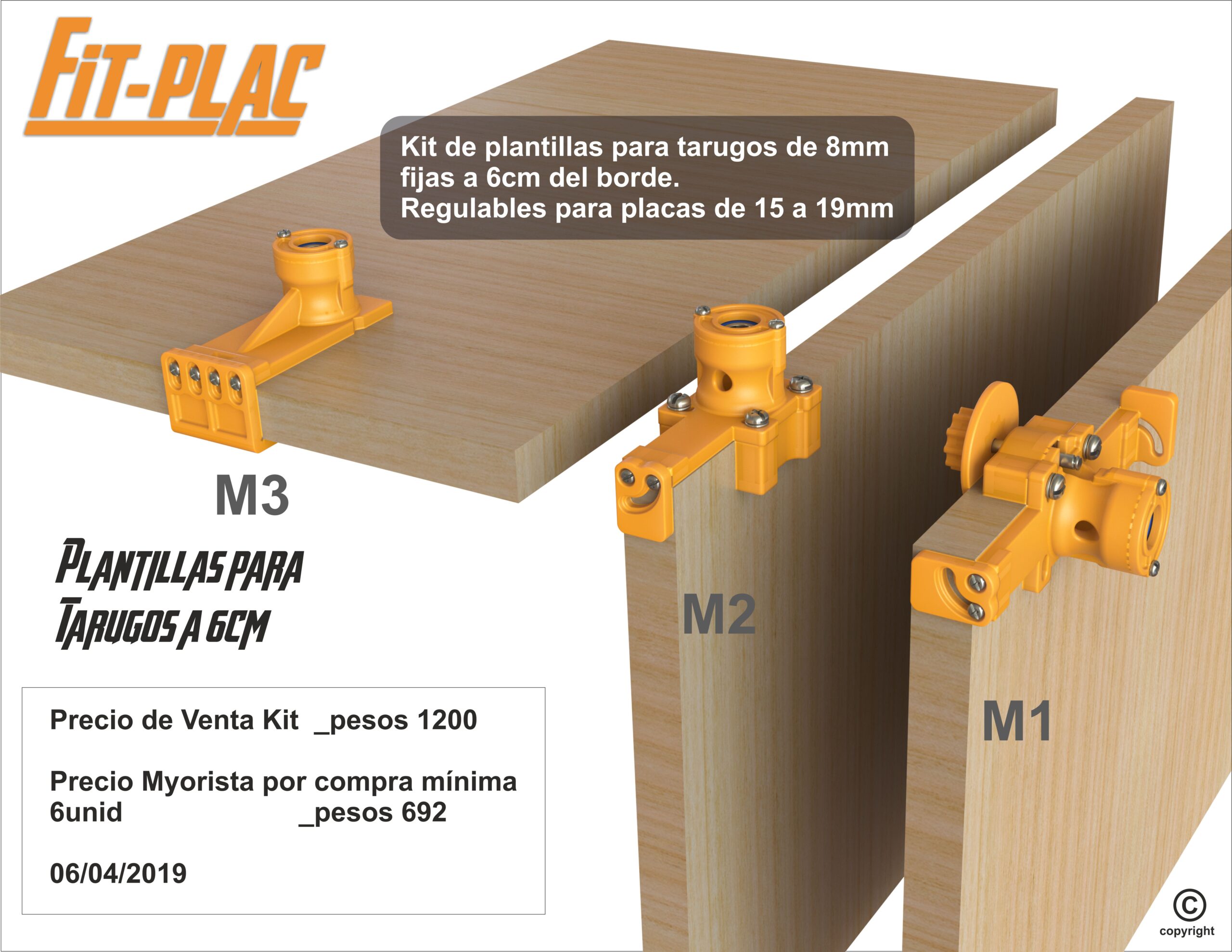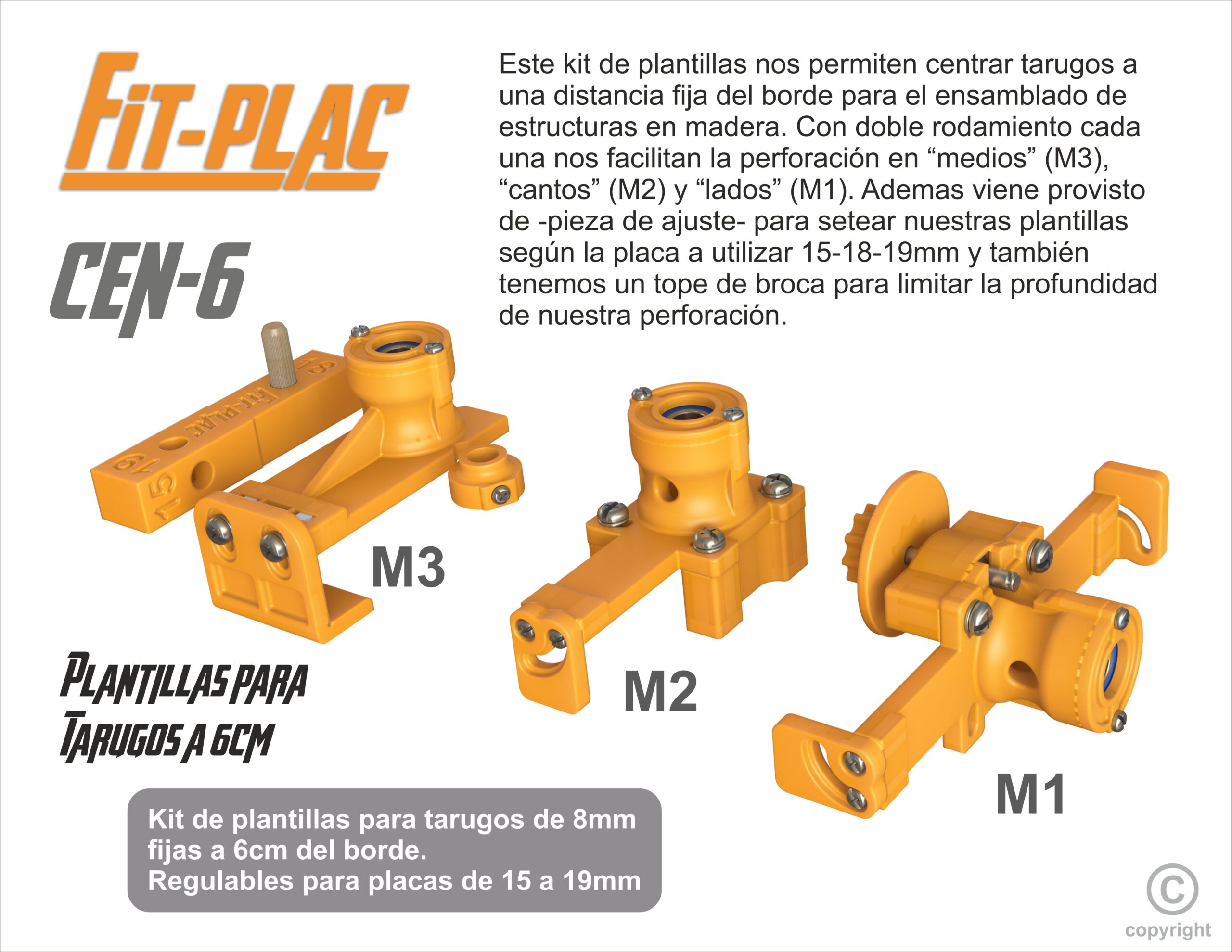 Este kit de plantillas nos permiten centrar tarugos a una distancia fija del borde para el ensamblado de estructuras en madera. Con doble rodamiento cada una nos facilitan la perforación en “medios” (M3), “cantos” (M2) y “lados” (M1). Ademas viene provisto de -pieza de ajuste- para setear nuestras plantillas según la placa a utilizar 15-18-19mm y también tenemos un tope de broca para limitar la profundidad de nuestra perforación.